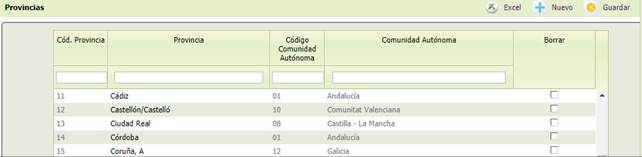 - [Cód. Comunidad Autónoma] Código de la Comunidad Autónoma. Al dar de alta un nuevo registro habrá que introducir un código válido (presente en el catálogo Comunidades Autónomas), hacer doble clic sobre su posición o utilizar el icono asociado a tabla auxiliar para acceder a la sub-pantalla “Comunidades Autónomas” dónde se elegirá una CA válida del listado. Obligatorio.