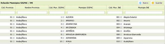 - [Cód. Mun. INE] Código del Municipio INE. La lista de valores que se muestra pertenece a los códigos de Municipios INE creados previamente para la Provincia seleccionada. Obligatorio.