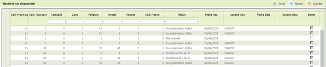 - [Borrar] Check para permitir el borrado solamente en los recintos cuyo motivo de la baja sea del tipo 3 “Alta manual”. Para el resto de recintos no se permite la eliminación de los mismos.