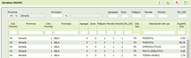 Además de los campos introducidos en el formulario inicial, se muestran para cada registro de recinto SigPac los siguientes campos:
