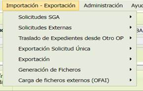 Las dos primeras opciones se refieren a la Incorporación de Solicitudes a SGA, pero diferenciando su origen, así desde la primera opción se accede a las Solicitudes Incorporadas desde SgaCap y desde la segunda opción se accede a la información de la incorporación de Solicitudes Externas a SGA.