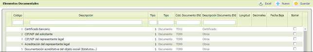 En lo relativo a Documentos que acompañan, en esta primera opción de Elementos Documentales se definen cada uno de ellos, dando opción a dar de altas nuevos, que serán tenidos en cuenta en las tablas del Gestor Documental.