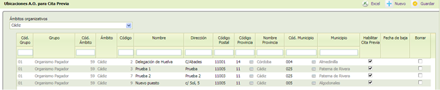 Desde esta opción se podrán configurar ubicaciones por ámito organizativo de la Cita Previa.