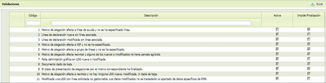 Dentro de esta opción, disponible sólo en modo de Consulta, se pueden consultar las validaciones vinculadas a los distintos tipos de alegaciones. Se pueden activar/desactivar y elegir si impide o no la finalización de la alegación. En ningún caso se podrá eliminar o dar de alta nuevos registros. La pantalla presenta el siguiente aspecto: