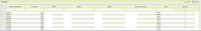 En la pantalla de ejecución del proceso de desbloqueo de expedientes con Alegaciones a la Solicitud Única, se mostrará un listado de todos los expedientes que estén bloqueados por estar en tramitación una Alegación a la Solicitud Única. Presenta el siguiente aspecto: