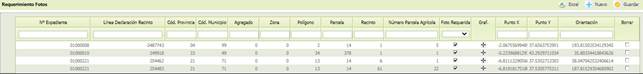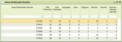 - [Línea Declaración Recinto] Código interno de la línea de declaración o recinto. Una vez indicado el Nº Expediente, al pulsar sobre este campo se abrirá un formulario con las líneas de declaración de dicho expediente, de entre las que se deberá seleccionar una.