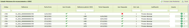 -Procesar lotes pendientes: opción que permite lanzar un proceso para que todos los lotes SIRIC sin respuesta sean procesados de nuevo.