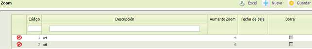 En esta opción se pueden parametrizar los valores de zoom que estarán disponibles en el campo “Zoom de cámara” de la pantalla de información asociada a la foto en la Revisión Documental Fotos.