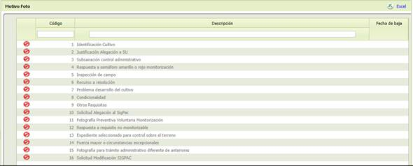 Esta pantalla muestra el código y la descripción de los motivos de las fotografías georreferenciadas. Desde esta pantalla también se puede grabar la fecha de baja de los mismos.