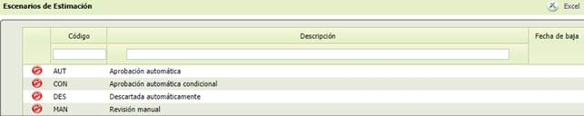 Esta opción recoge los distintos escenarios posibles en función de la calificación final de imágenes tras CIM y REC para determinar si impide la aprobación de la foto, permite su revisión manual o la aprueba automáticamente. Es una opción exclusivamente de consulta, y presenta el siguiente aspecto: