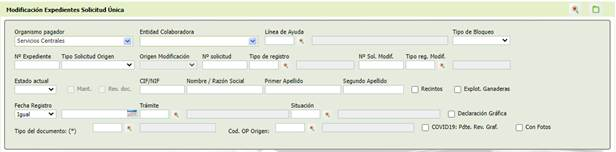 - [Origen Modificación] Lista de valores que permite filtrar por el tipo de solicitud original sobre el que se ha realizado una Solicitud de Modificación. Sólo se activará cuando en el campo [Tipo Solicitud Origen] se seleccione Solicitud de Modificación.