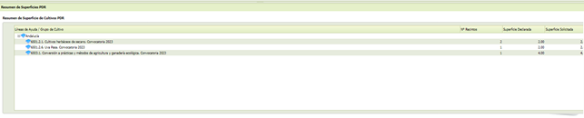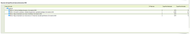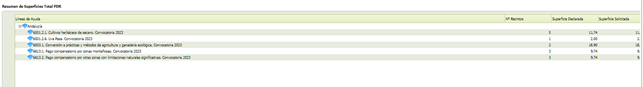 - [Superficie Solicitada (ha)] Superficie solicitada por línea de ayuda y recinto que se muestra en los Datos Específicos del Recinto.
