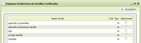 para dar de alta una Empresa Productora de Semillas Certificadas, se despliega la siguiente pantalla, donde aparece filtrado el Tipo de Organización por el código 14: Empresas Productoras de Semillas Certificadas