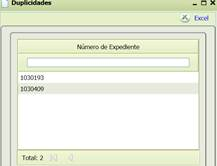 La pantalla muestra los expedientes donde se produce la duplicidad: