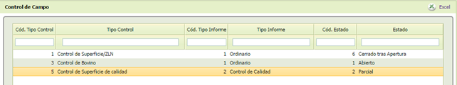 - [Cód. Tipo Informe] Código del Tipo de Informe de Control de Campo. No modificable.