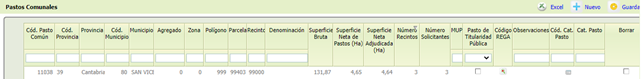 - [Cód. Municipio] Código del municipio del pasto comunal según referencias SigPac. Campo modificable, obligatorio y distinto de cero. Se podrá seleccionar de una lista de valores que mostrará los municipios válidos en función de la provincia seleccionada.