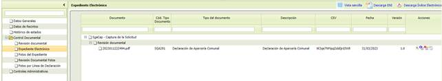 Desde esta opción será posible consultar el expediente electrónico asociado al expediente de aparcería comunal, así como descargar el mismo, añadir nuevos documentos o quitar la asociación de un documento determinado que forme parte del expediente electrónico.