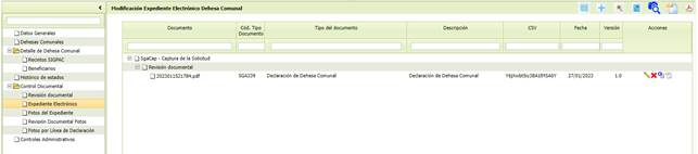 Desde esta opción será posible consultar el expediente electrónico asociado al expediente de dehesas comunales, así como descargar el mismo, añadir nuevos documentos o quitar la asociación de un documento determinado que forme parte del expediente electrónico.
