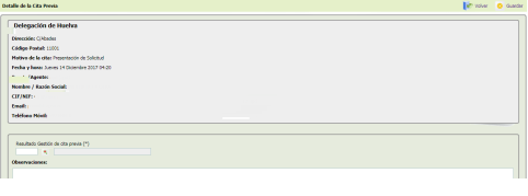- [Observaciones] Campo de texto para indicar las observaciones a la cita previa. Será un campo obligatorio en los cosos en los que el resultado se haya parametrizado como que es obligatorio indicar observaciones.