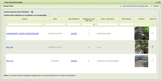 Si se marca en la casilla “Mostrar fotos realizadas en la solicitud y no incorporadas” se mostrarán todas fotos que de las solicitudes de captura que no se han asociado al expediente.