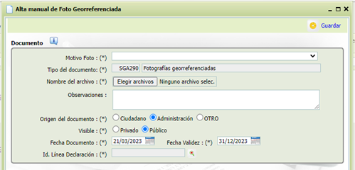 - [Tipo de Documento] Por defecto vendrá seleccionado con el documento 290 – Fotografía georreferenciada.