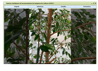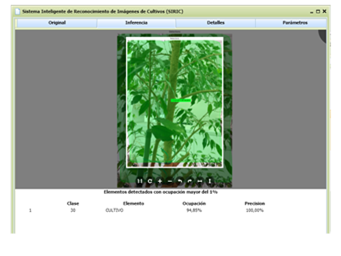permite acceder a los resultados del Sistema Inteligente de Reconocimiento de Imágenes de Cultivos (SIRIC). Encontramos cuatro pestañas de información: Original, Inferencia, Detalles y Parámetros.