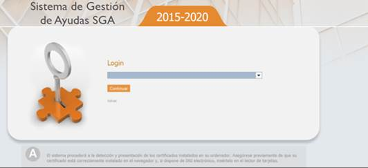 Una vez ejecutado el enlace correspondiente en el navegador se visualiza la pantalla de acceso al entorno del Sistema de Gestión de Ayudas (SGA):
