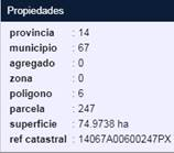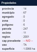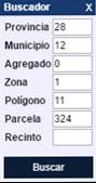 ·Buscar parcela/recinto (ñ+ B): muestra un panel donde introducir los códigos SIGPAC de la parcela o recinto a buscar. En caso de que no exista se mostrará un mensaje de error. Si existe se mostrará en la vista.