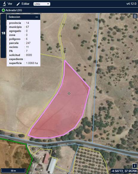 El componente gráfico trabaja con las líneas de declaración gráficas (LDG). Cada LDG representa una superfice continua definida en un único recinto SIGPAC. La geometría de una LDG no se puede definir más allá de los límites de su recinto SIGPAC. Tampoco puede solapar con otras LDG de la misma solicitud aunque sí puede hacerlo con las de otras solicitudes.
