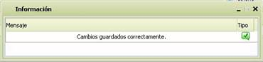 Se muestra al realizar una determinada función dentro de un formulario. En el caso de haber hecho una cumplimentación correcta y guardar los datos aparecerá un mensaje de confirmación (simbolizado con el iconito verde) similar al siguiente:
