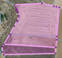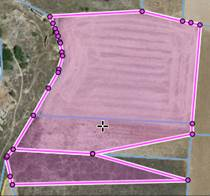 · Modifica LDGs (M): sirve para alterar la superficie de una o más LDG, bien añadiendo o desplazando cualquiera de sus vértices (representados con círculos), bien eliminándolos pulsando sobre ellos. En el panel de mensajes se mostrará dinámicamente la superficie modificada. Para modificar un perímetro colindante a varias LDG, se pueden seleccionar dichas LDG de forma que se puedan mover de forma solidaria sus vértices comunes.
