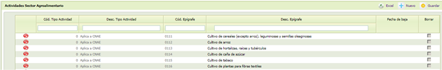 Catálogo de Agricultor Activo que recoge las distintas actividades del sector agroalimentario englobadas en los distintos tipos de actividad presentes en el catálogo Tipos de Actividad IAE. Presenta el siguiente aspecto: