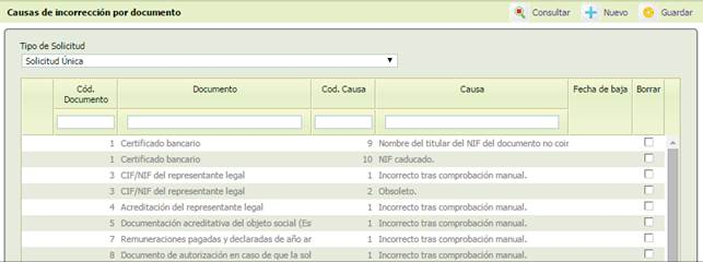 La funcionalidad de este catálogo es asociar las causas de incorrección dadas de alta en el catálogo anterior a un Documento, haciendo que se muestren en la pantalla deRevisión Documental.