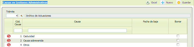Una vez elegida aparecerá en un segundo bloque los valores asociados de las causas asociadas para cada Gestión Administrativa, en una tabla similar a la de los otros catálogos del grupo: