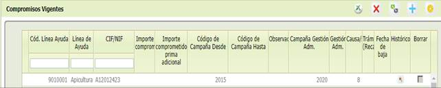La pantalla dispone de funcionalidad Duplicarpara permitir duplicar compromisos vigentes con fecha de baja posterior a la actual y de la funcionalidad Eliminar registros por líneapara permitir eliminar compromisos vigentes por línea de ayuda.