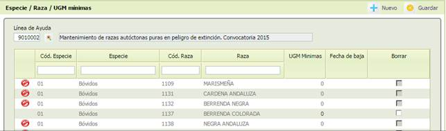 Elegida la línea, se mostrarán las especies / razas asociadas, con los campos: