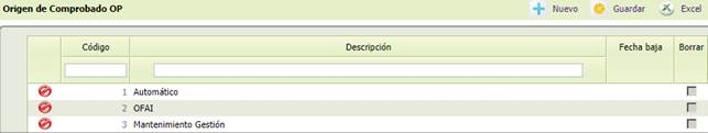 Catálogo auxiliar en el que figuran los distintos orígenes de los que pueden proceder los comprobados OP. Presenta el siguiente aspecto: