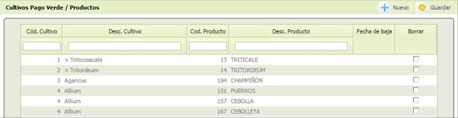 -[Cód. Cultivo] Código del cultivo a efectos el eco-régimen. Al dar de alta un nuevo registro habrá que introducir un código válido, hacer doble clic sobre su posición o utilizar el icono asociado a tabla auxiliar para acceder a la sub-pantallaCultivos,dónde se elegirá un valor válido del listado. Obligatorio.