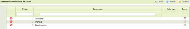 Catálogo de consulta y modificación de Sistemas de Producción de Olivar. Presenta el siguiente aspecto:
