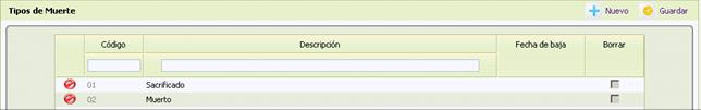 - [Código] Código del tipo de muerte del animal. Obligatorio.