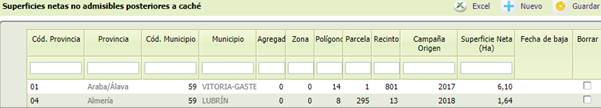 Este catálogo auxiliar presenta los mismos campos que el de Superficies no admisibles posteriores a caché, con la diferencia de que se muestra la superficie neta en lugar de la superficie bruta.