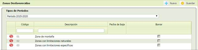 Consta de un primer bloque donde se elige el Tipo de Periodo por medio deuna lista de valores. Obligatorio para poder asociar la zona desfavorecida al periodo de ayudas PDR.